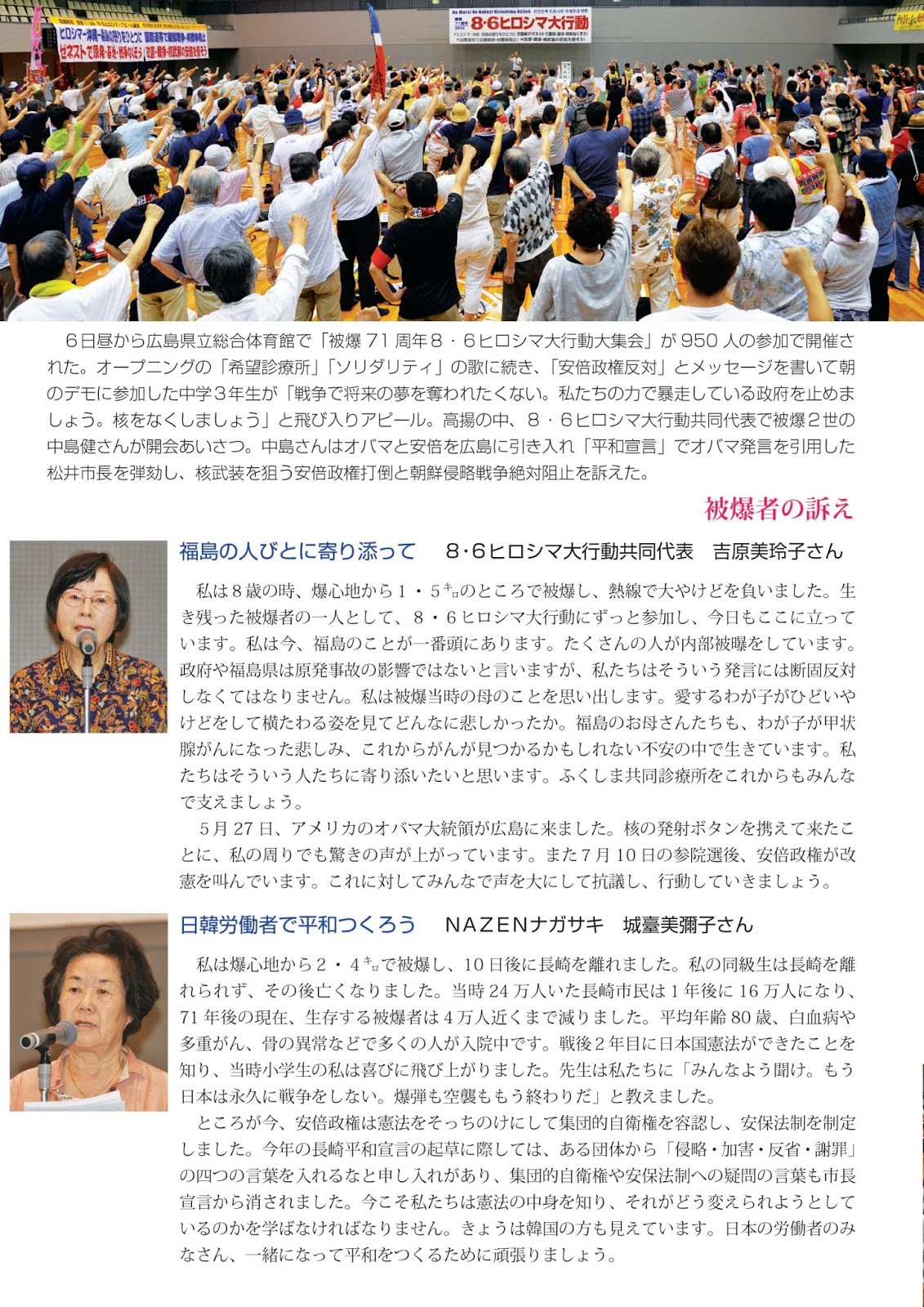 すべてを決するのは、職場、学園、地域における労働運動、学生運動、様々な現場の闘いです。国会の「改憲勢力3分の2」など実際には労働者民衆の支持などまったく受けていないし、参院選や都知事選の結果をみても安倍政権はきわめて脆弱です。参院選では「新しい労働者の政党をつくろう」「戦争・改憲絶対反対」「労働者こそが社会を変える力を持っている」と訴えた鈴木たつお候補(8・6ヒロシマ大行動呼びかけ人)に1万6187票が集まりました。職場と地域に闘う拠点をつくりだす闘いを全国でやりましょう。